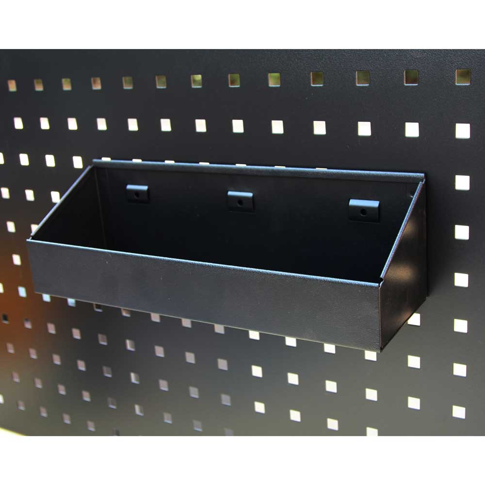 The 33cm Pegboard Tray is a durable and functional storage solution, designed to maximise organisation on your square pegboard. Made from black powder-coated steel, this sturdy tray provides secure storage for tools, accessories, and small parts, keeping them easily accessible in your garage, workshop, or tool station.