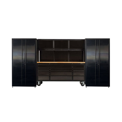 This multi-functional workbench set features 14 lockable drawers, including a 1.26M-wide Mega Drawer, overhead storage cabinets with gas strut doors, a durable wood benchtop, and a large pegboard with power-cord eyelets for added convenience. The system also includes two double-door tall cabinets, providing additional secure storage space. Built with high-quality black stainless steel and reinforced steel frames, this heavy-duty workstation offers ample storage, accessibility, and mobility with its industrial-grade caster wheels.