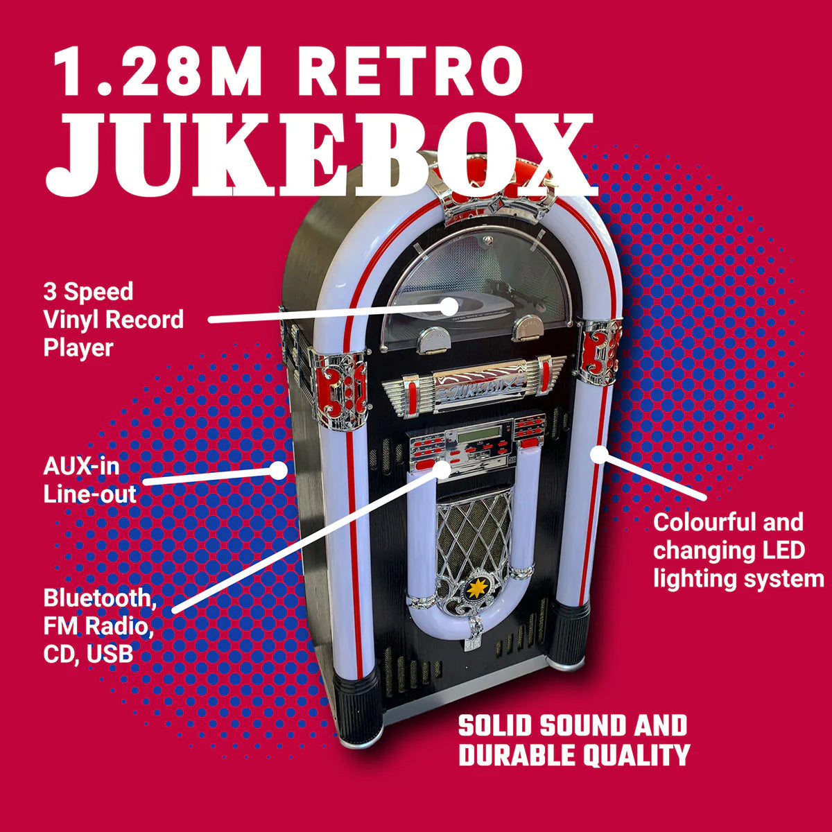 Bring the ultimate retro vibe to your space with the Retro Jukebox 128cm H 80W Sound System. This full-size 1.28M jukebox blends classic aesthetics with modern audio technology, allowing you to play vinyl records, CDs, USB, SD cards, FM radio, or Bluetooth streaming.