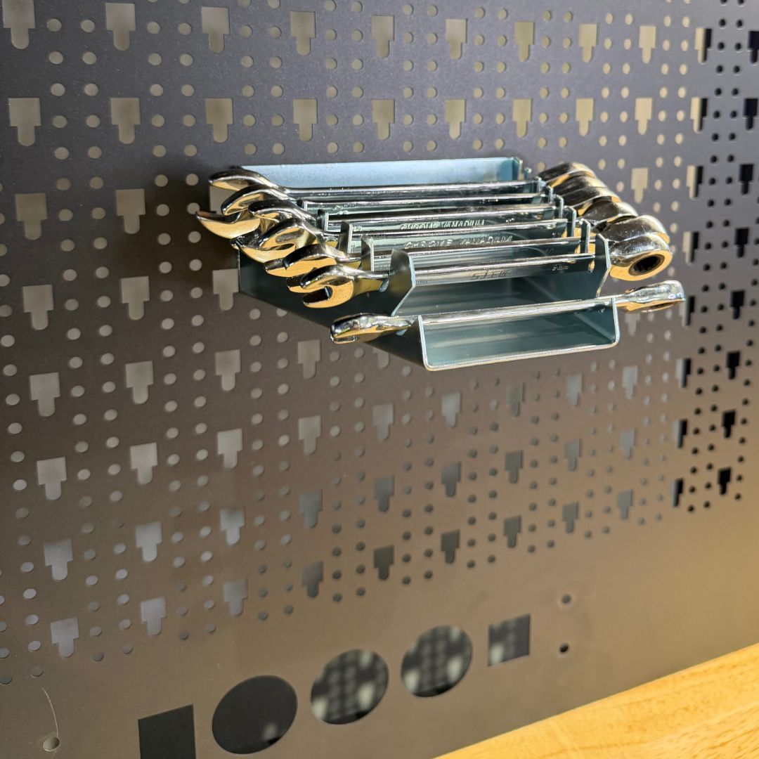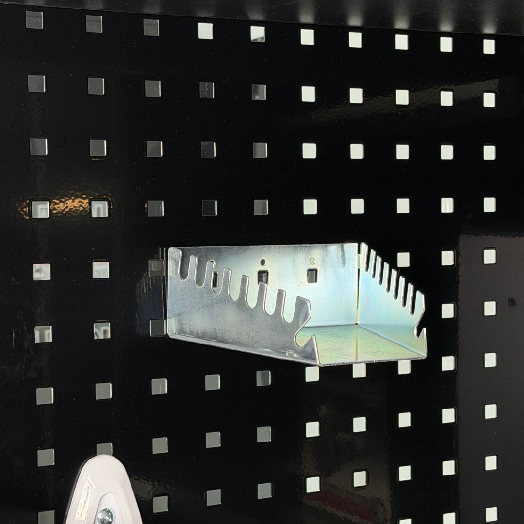 The Spanner Holder is a durable steel vertical tray, designed to store up to 8 spanners neatly on your square pegboard. Providing quick and easy access to your spanners, this sturdy holder helps keep your garage, workshop, or tool station organised and clutter-free. Available in black or silver, it offers a secure and professional storage solution for any workspace.